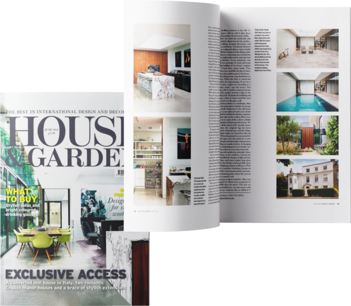 Our Richmond Hill project is featured on the front page of the June edition of House and Garden. Inside, pages 114-119 give the story of the development of the Grade II listed building. Franklin Project Management acted as Construction Manager in conjunction with Denis Kostenko Ltd providing the interior fit out package, which included kitchen and living space, wine cellar and an entertainment space that converts into a swimming pool at the touch of a button. The experience of the pool is enhanced by a full length, sliding roof light that allows the sun to shine on some complex engineering, expertly accomplished by Guncast Swimming Pools and Cantifix.